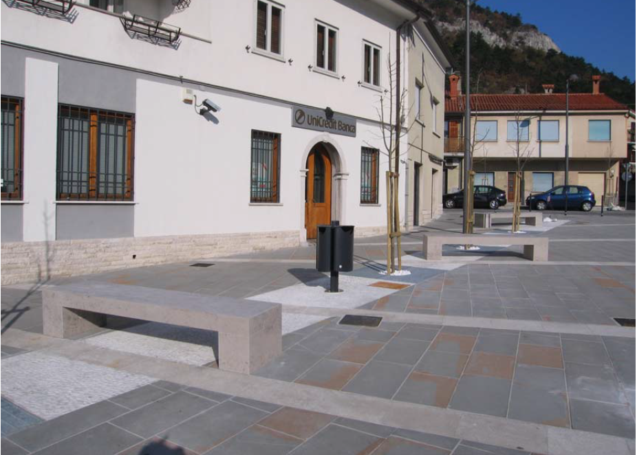 La pietra locale e la sua utilizzazione in modi differenti è il pprincipio che regola tutto il disegno della piazza. Luci, elementi monolitici, particolari architettonici si integrano nel nuovo contesto creato.